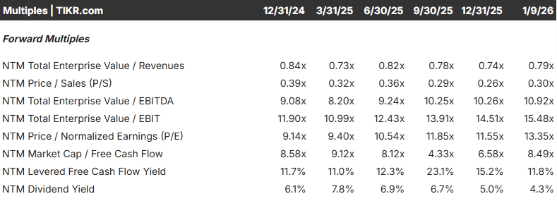 WHR currently trades at 0.3x NTM P/S and 10.9x NTM EBITDA for pretty limited revenue growth and ~10% EBITDA growth in FY26. As I said, I think the stock price for WHR is far more correlated to the home sale trend rather than sales and EBITDA multiples. With that being said, analysts expect $382M in FCF in FY26. That’s a huge jump from FY25 but very similar levels to FY24. WHR has historically traded ~20x FCF.