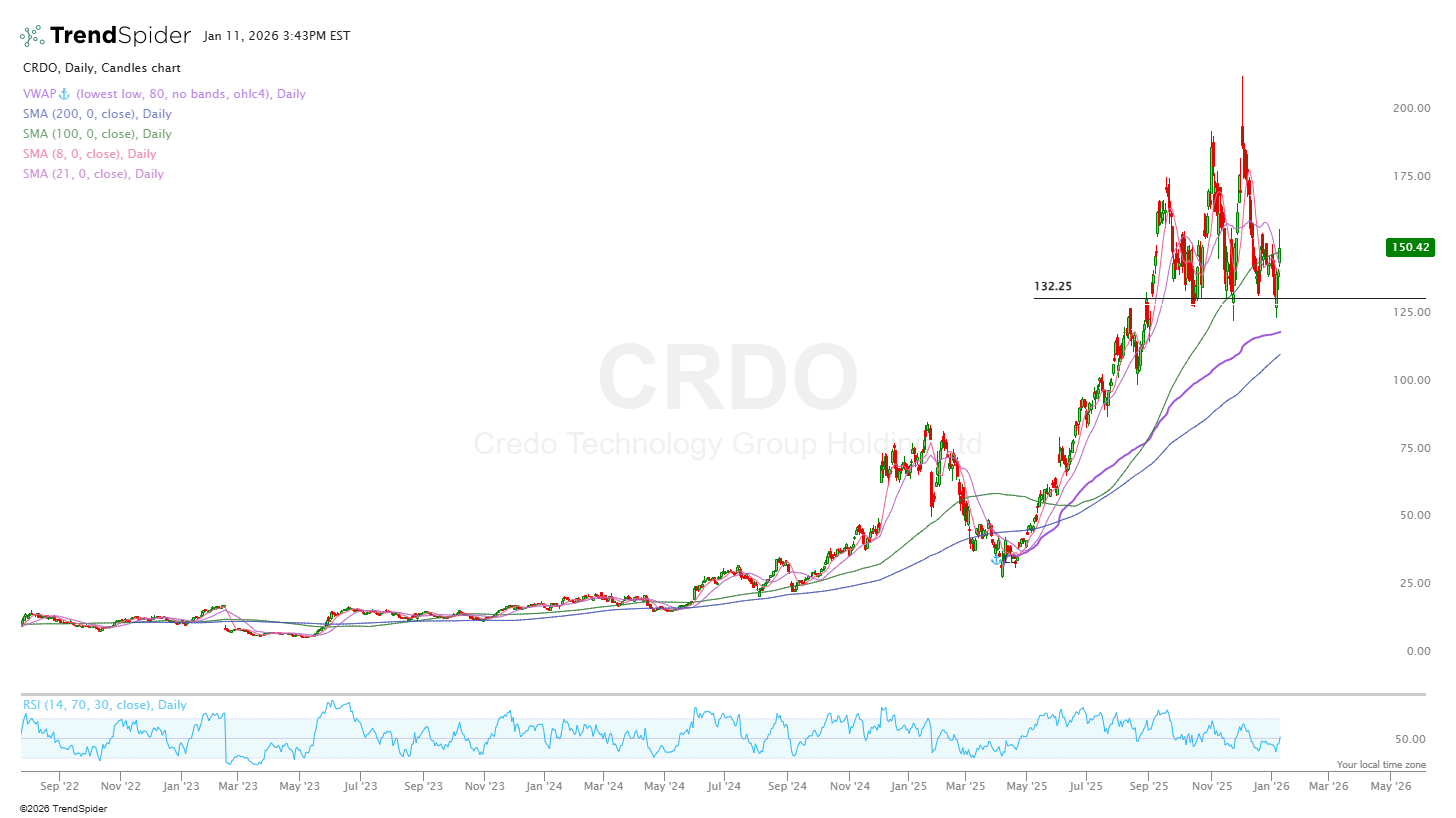 CRDO dropped ~25% before bouncing off this key support level I’ve highlighted on the chart below. It dropped on a couple of nonsensical news points regarding “cableless” design (not true) and a rumour that AMZN had dropped CRDO (also not true). I’m very bullish on the optics market which is where players like COHR and LITE operate, but CRDO currently dominate the AEC (Active Electric Cables) market.