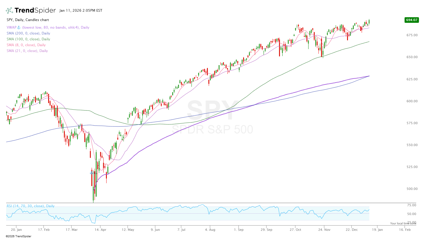 The market keeps going and the SPY just had its highest weekly close ever. We’re back above the 8-day MA and the 21-day MA which we’ve been battling with for the last few weeks. I’ve consistently said that as long as the SPY stays above the 100-day MA I’ll remain bullish. A key level below the 100-day is ~653. For now, we’re way away from that level.
