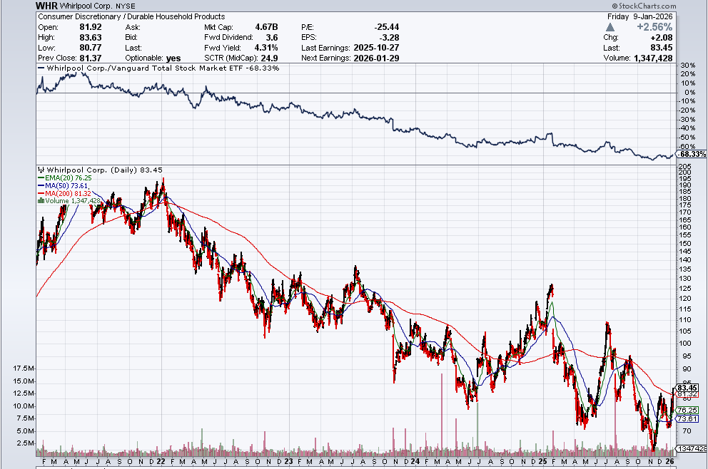 This recent news hasn’t showed up in the data yet but we did see pending sales jump 3.3% in November 2025 which was the biggest jump in nearly 3 years. I suspect the numbers are showing signs of reversal. WHR stock also shows this. The stock is up 27% since the lows on November 11th on no stock specific catalysts.