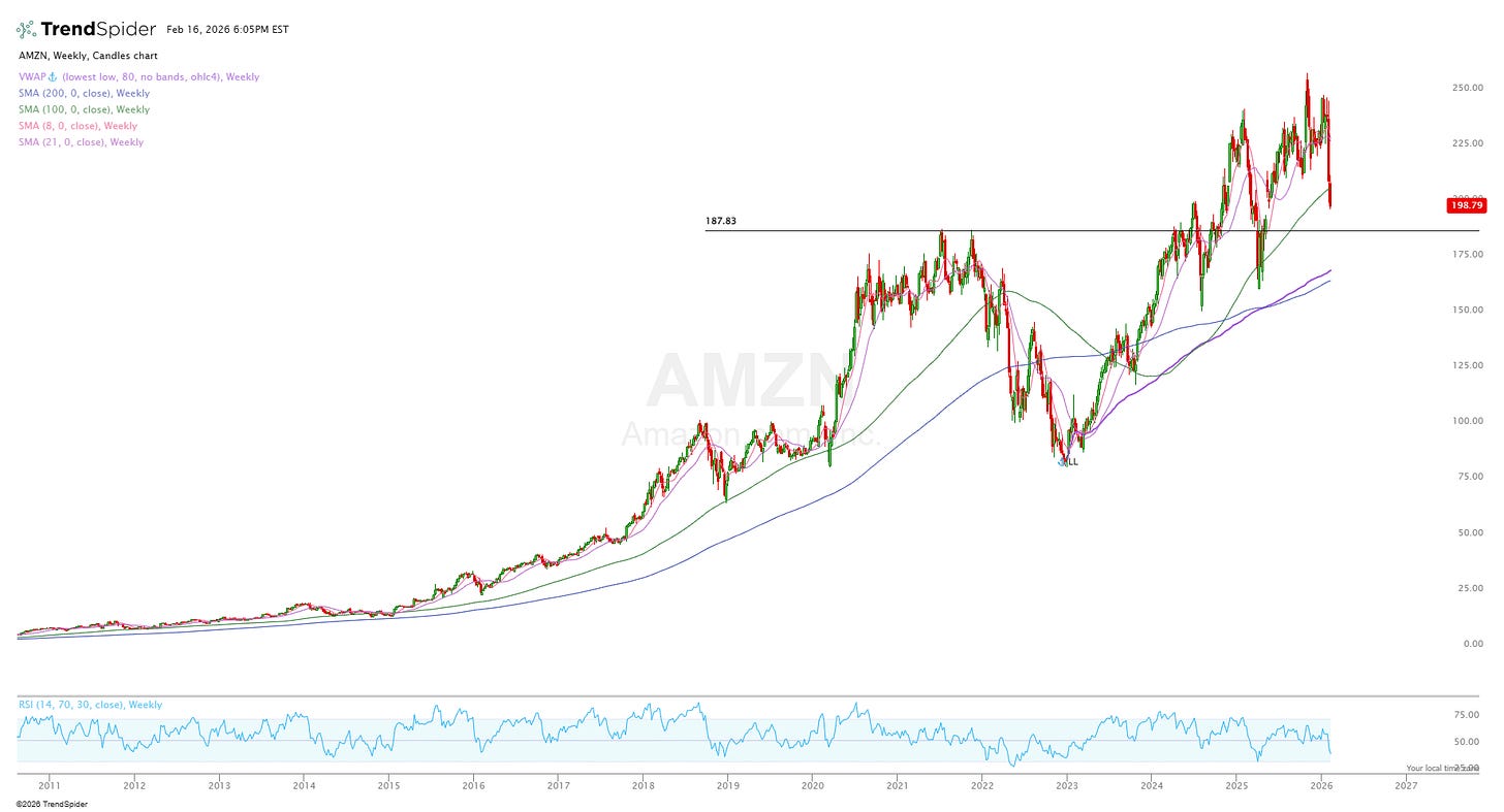 Last week I spoke about AMZN as my defensive play, and this week I’m sticking by that. There’s absolutely no change to my thesis and if the SPY breaks the 100 daily I’ll lean more into this position than I already am, especially so if we drop to this $187 level which is a key weekly level.