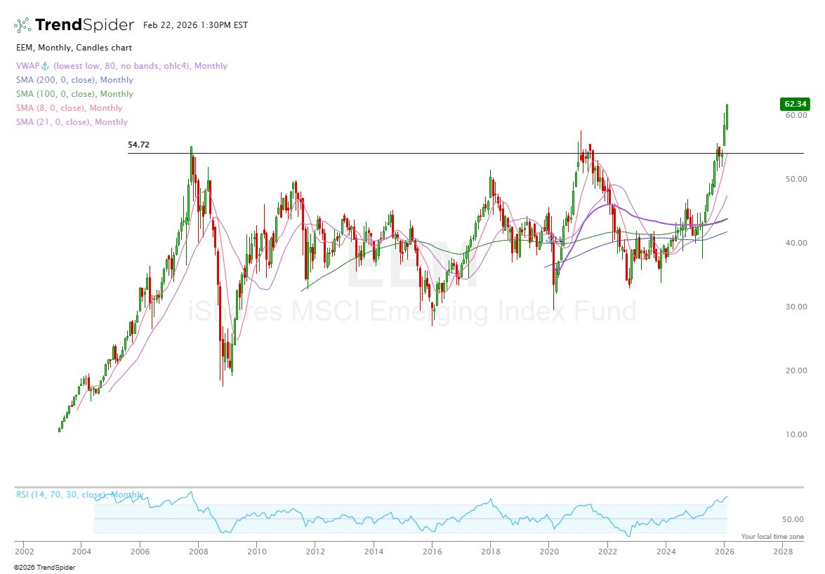 We’ve seen a clear breakout in the emerging markets over the last month with EEM (Emerging Markets Index Fund) just breaking above 2009 and 2022 highs for the first time.