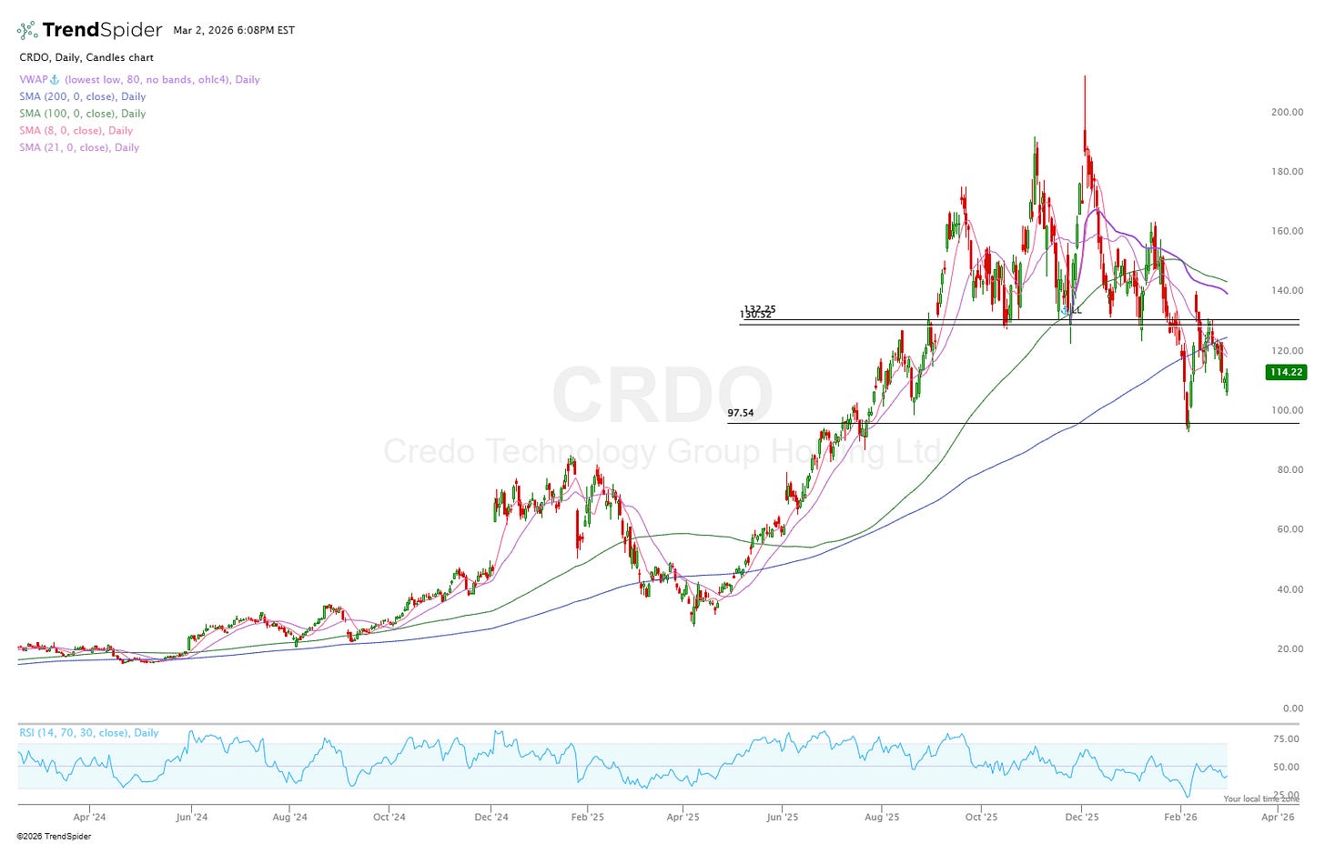 CRDO is one of the few interconnect stocks below the 200 daily right now.
