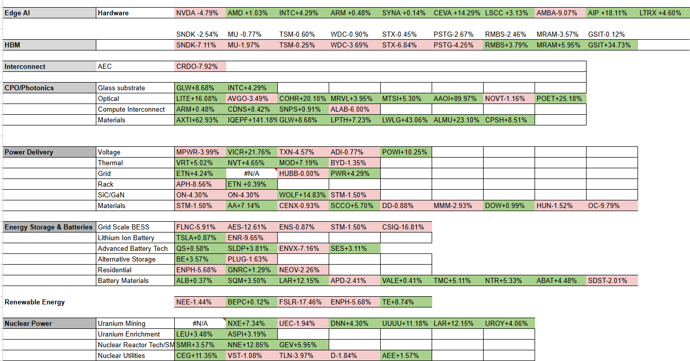 Here’s a snapshot of one of the tabs on my database. It shows the weekly price action of all the stocks per theme.
