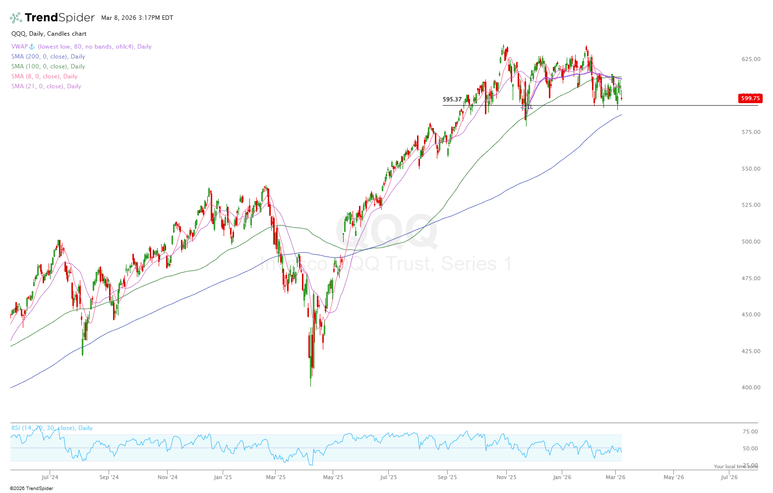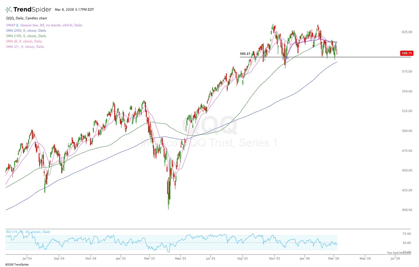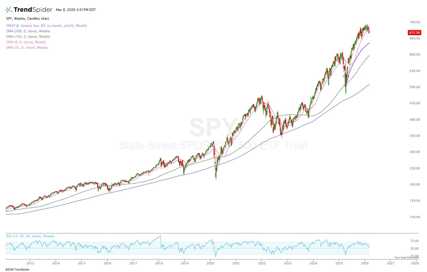We’ve finally seen a weekly close below the 8 and 21 MA and a few daily closes below the 100 MA. The 200 daily MA currently sits at ~656 which would be a drop of ~2.5% from today’s level which seems completely feasible. The last time we broke the 200 daily on the SPY was March 7th 2025, almost 12 months ago exactly and from there the index fell another 15.4% before eventually recovering.