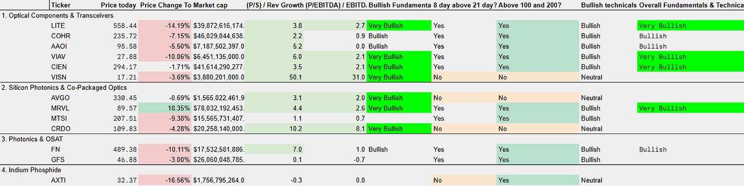 I created this back in December 2025 before LITE and AAOI had their massive runs. It gives you a list of all the stocks within the theme measured by revenue and growth rates relative to multiples and also combines that with where the stock is trading technically vs key MA’s.