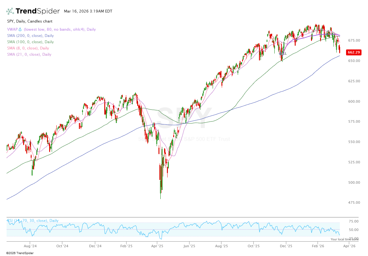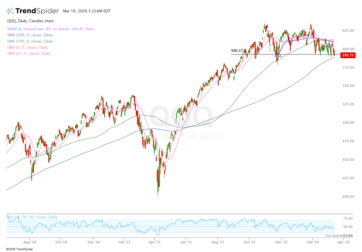 Price action on the SPY looks pretty bad right now, but the macro reasons behind this could change in a day. On the QQQ, it looks like tech had it’s pullback and so far we’re holding structure here, but a break of this 595 and 200 daily MA here will be the key focus this week (again).