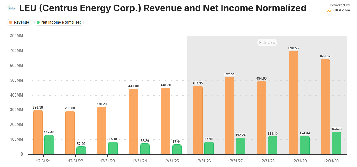 Mid case revenue estimates are ~$650M in revenue in FY28 with $121M in net income. I know the above chart gives $495 in revenue, but I think that’s a data issue and a clear anomaly. LEU currently trades at 59x NTM PE which sounds pricey but when you’re growing net income ~28%, with long-dated contracts, US government support, and a huge backlog it doesn’t seem too high.