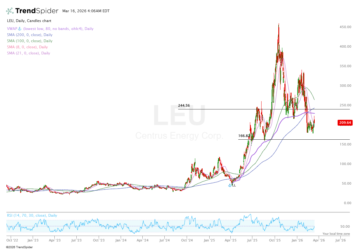 I personally have no position in LEU yet but it’s probably in my top 5 buys as soon as I start deploying cash. It remains still below the 200 and 100 daily MA’s but it has reclaimed the 21 daily.