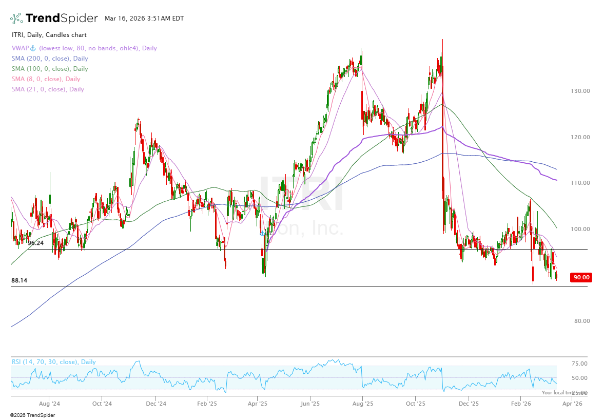 Paid subs will know that I’ve spoken about ITRI a lot recently but have only put a small starter position amount of money into the stock right now. This $90 level that I have charted out is extremely key to hold here.