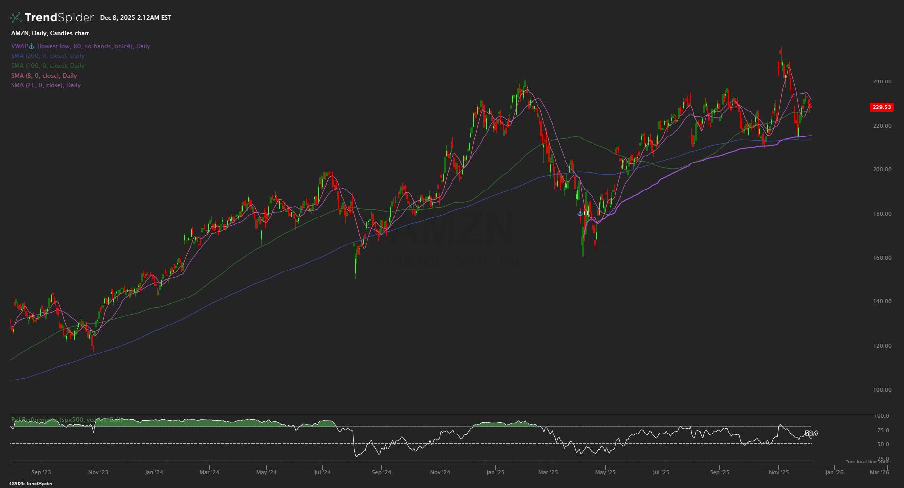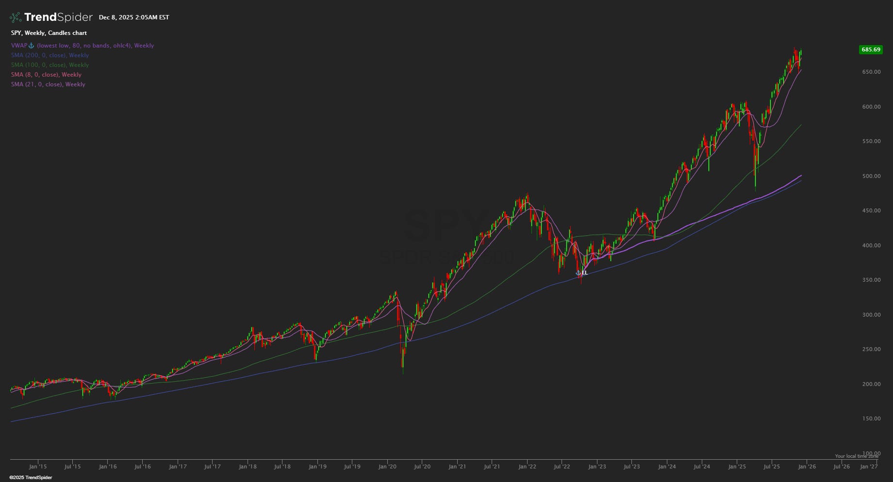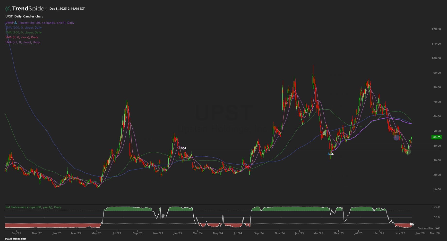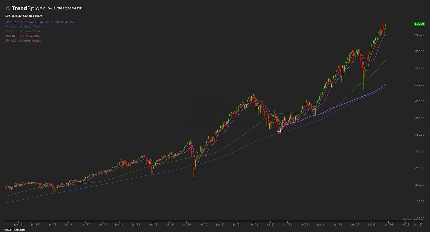 At the weekly candle it’s still clear we’re struggling to make a higher high above the end of October’s high at $690. I wouldn’t be surprised at all if we see a red week this week based purely on the technicals. We have the FOMC policy meeting on December 10th with markets pricing in a 25bps cut. I think no cuts could cause a selloff in the SPY especially rate sensitive stocks in our portfolio like RKT, and UPST. Lower December liquidity could amplify these moves.