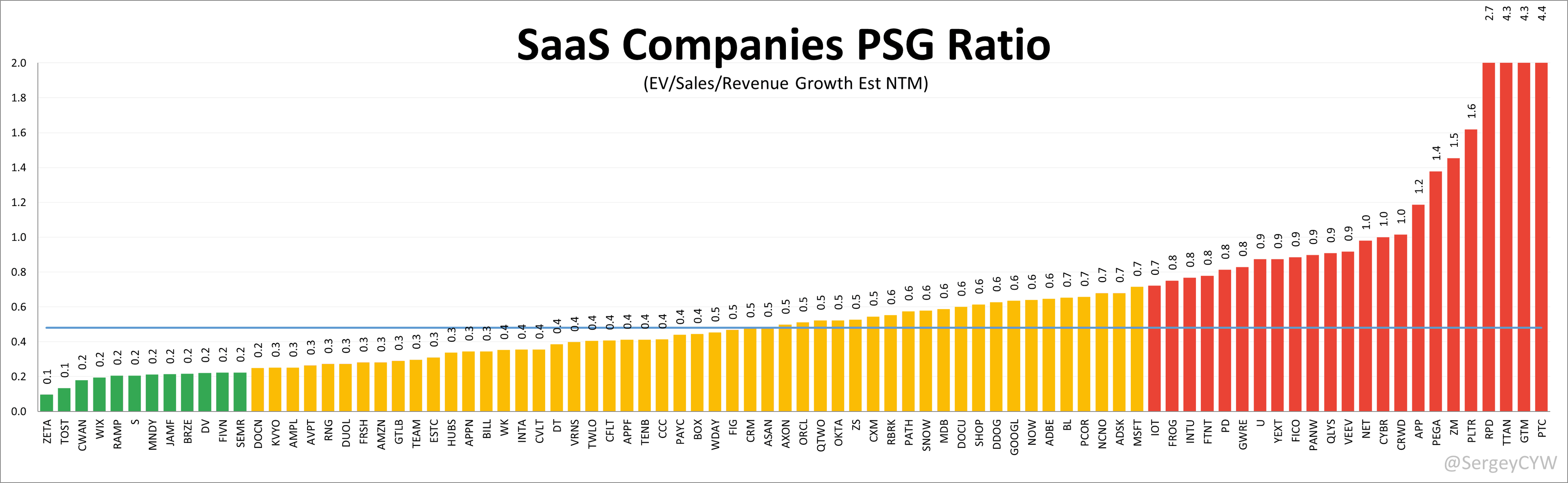 Full credit to SergeyCYW for making this chart he posted on X. It’s got a list of SaaS companies based on PSG (Price/Sales/Growth) which offers a nicer perspective than just P/S and it’s what I base a lot of my Spreadsheet on for Paid Subscribers. I have a list of many stocks based on sales/EBITDA/EPS all relative to growth metrics and then from there I make label them as attractive or not.