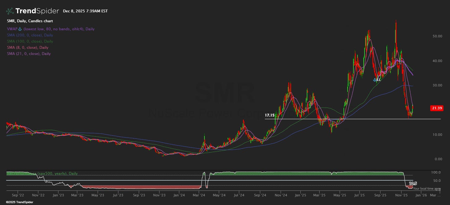 SMR remains very high risk since it’s still not building SMR’s (likely won’t for over a year). SMR is therefore purely a play on whether you think they’ll be successful in building small nuclear reactors to overtake large players like CEG. I think a good way to play this is wait for price to come back down to the key support line and then start building a small position around that zone as soon as we see some rejection of the support. We’ve already seen one nice bounce there so I think if we get 1-2 more then this key support at $17 could be a nice short term bottom.