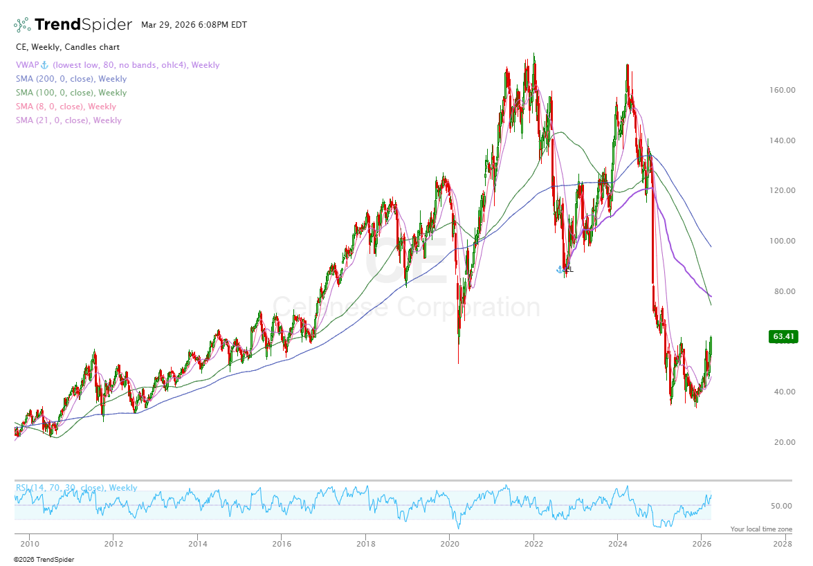 On the “safer” side, a lot of chemical demand is anchored to must-have end markets like autos, energy, defense, and infrastructure. That means volumes are tied to government spending, reshoring, and basic economic activity rather than just hype cycles. And then when you layer in the fact that many chemical prices are fairly well tied to oil and gas prices you have a theme that is quite nicely a more defensive play on the Middle East tensions.