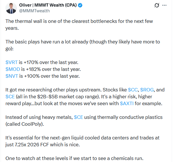 At the same time, chemicals are a huge beneficiary of the AI buildout. Here’s a post I put out on X on March 2nd 2026 for example.