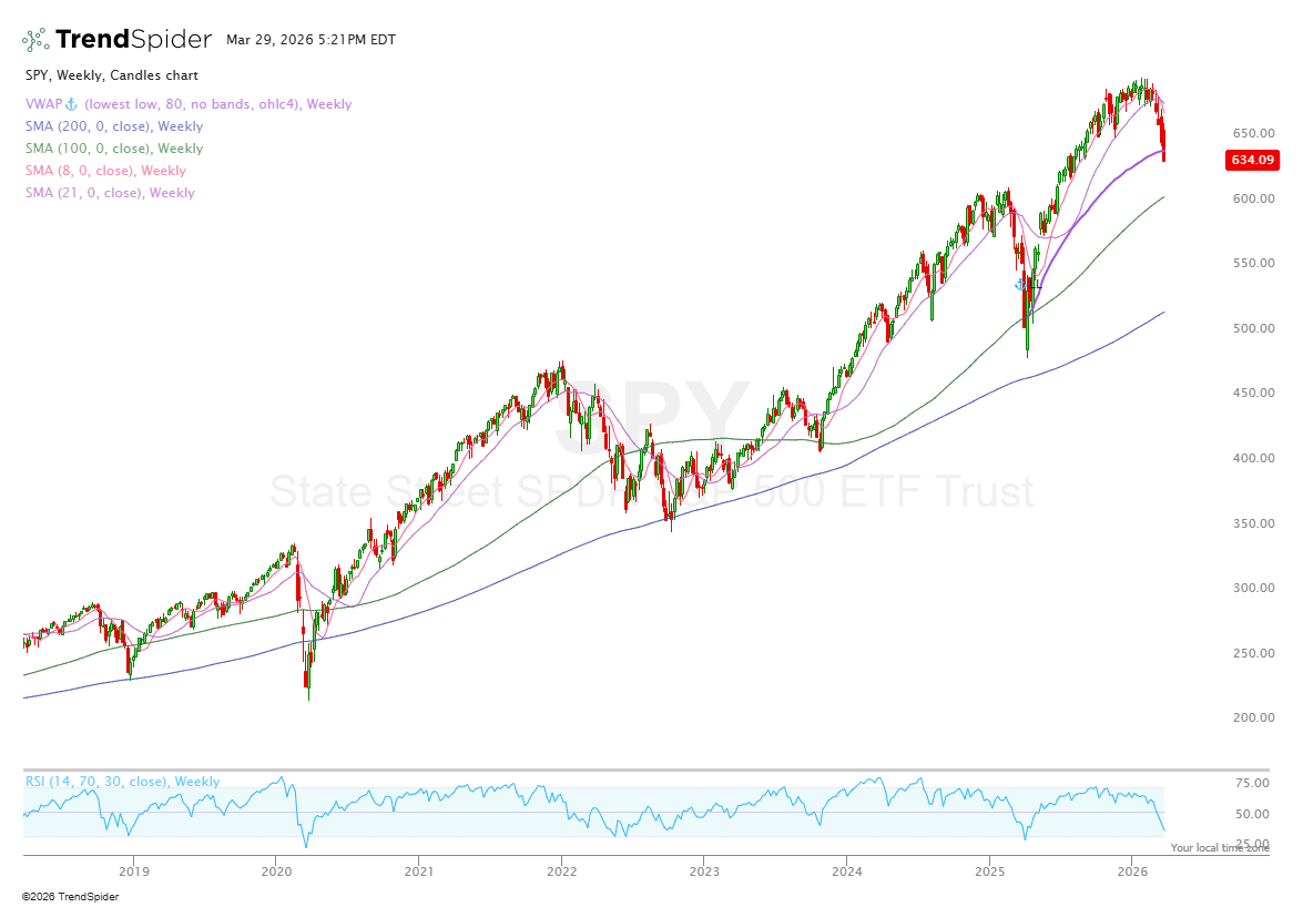 The SPY had its worst week since the start of the Iran war down 2.2% over the last week making this its 5th straight weekly close and now ~8.7% above from highs. More importantly, the SPY reaffirmed its position under the 200 daily this week and looks to be now heading towards the next key level which is the 100 weekly at 608 (another 4.1% decline from here).