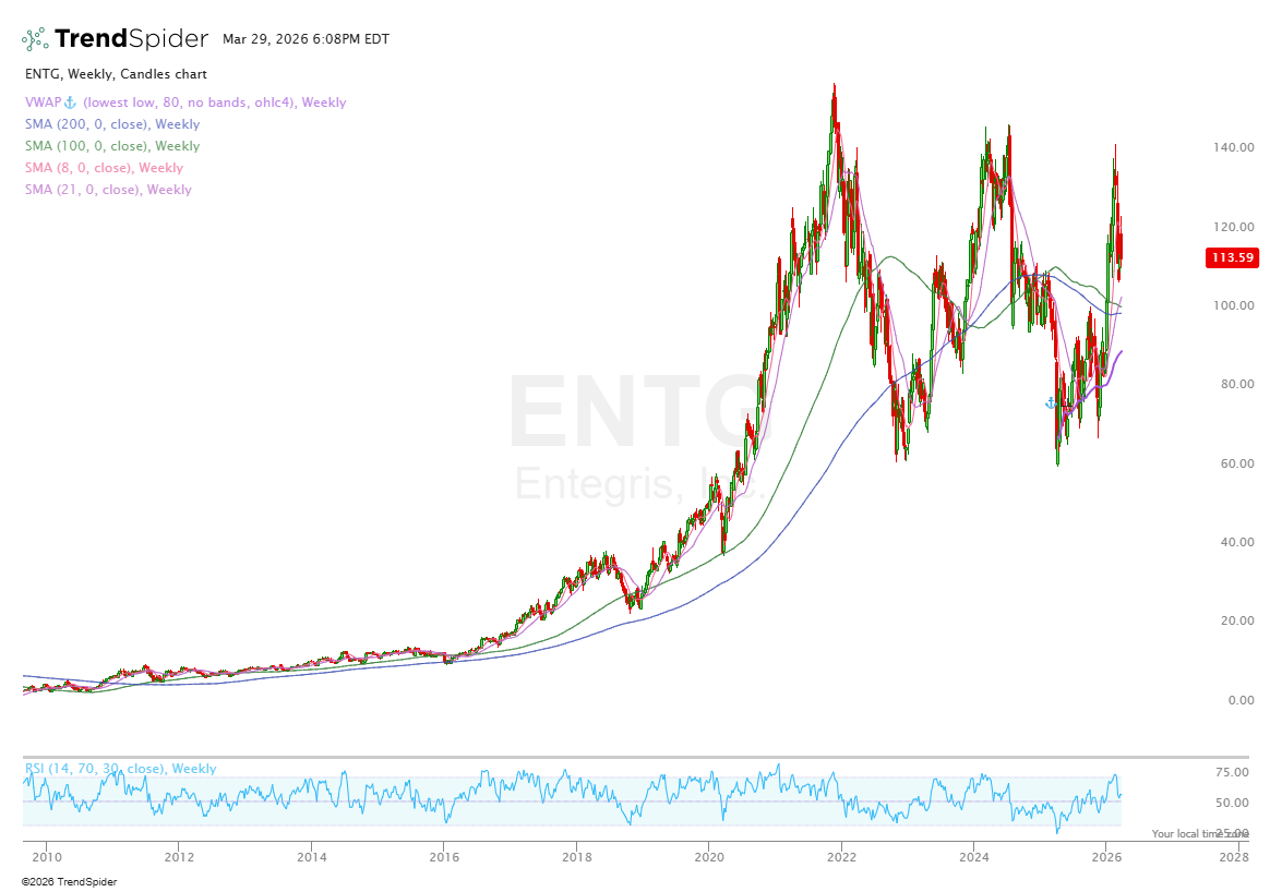 Entegris | ENTG: ENTG sells the ultra-pure chemistries and materials that lets fabs run at scale. It’s the cleanest play on every incremental wafer and layer of complexity driving more contamination control, and more content per too. ENTG is far pricier than CE at 39x FCF but if there’s a continued chemicals bull market I see upside here as well.