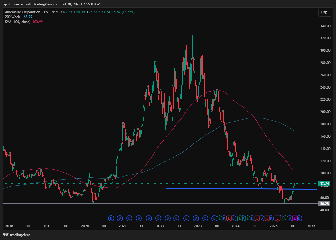 Last week ALB broke this downtrend of lower highs and lower lows which essentially has been going on since 2023 and paid subs will know exactly what I did here.