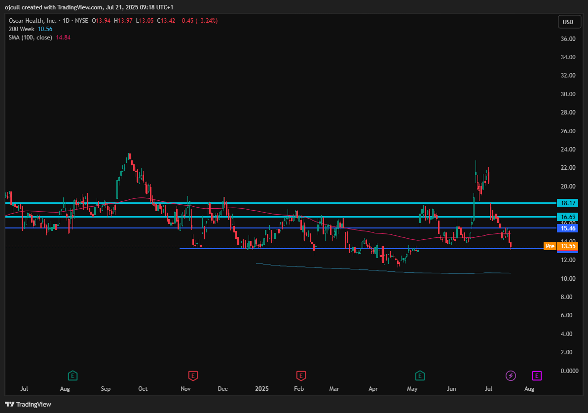 OSCR had another pretty poor week but it did have a little bounce off the next support zone at $13.20. Fundamentally, this is a huge buy. Technically too.