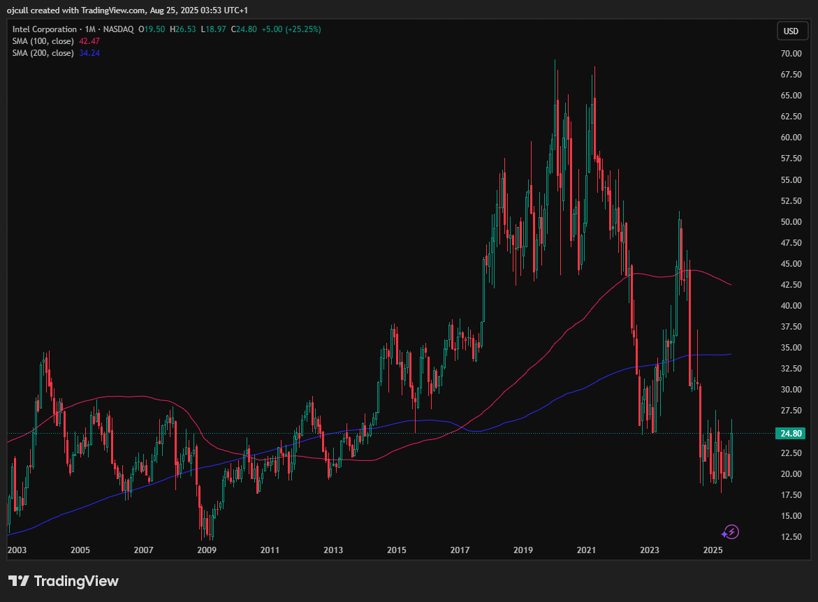 INTC is now owned 10% by the US Government as they continue to transition from a chip designer to a fabricator competing with the likes of TSM. With negative earnings this is a true turnaround, value play. I don’t love the company mainly because the complexities of becoming a good fab company are extremely challenging and INTC does not have the expertise currently to do so.