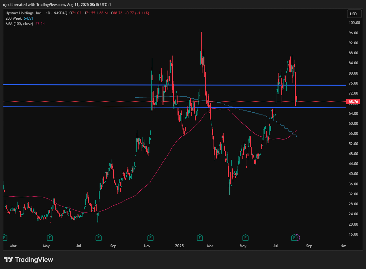 UPST are now trading back in the $60s just above this zone (bottom blue line) which is where I added last week as paid subs will know.