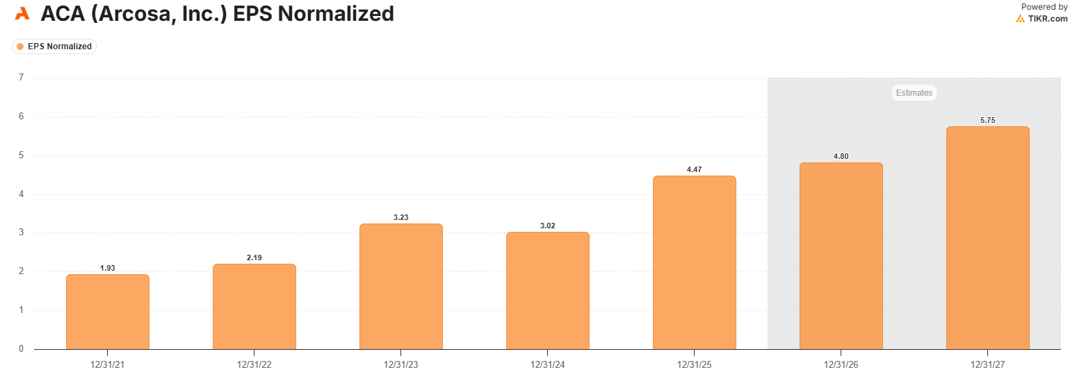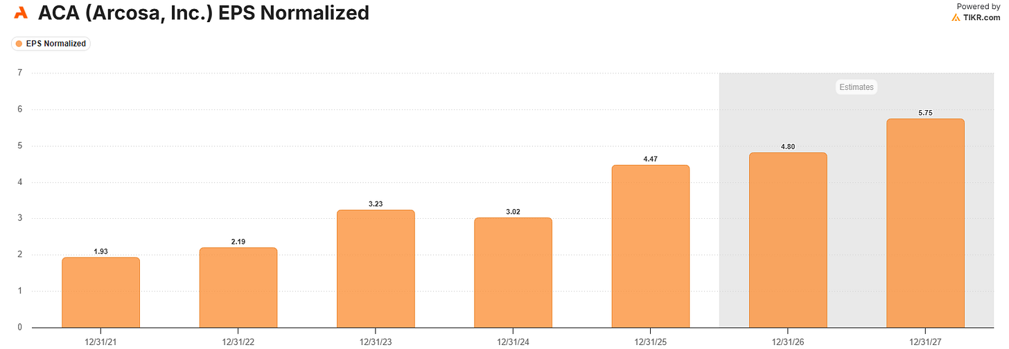 For a hardware company like ACA, estimates are actually very strong with EPS set to grow to $5.75 in FY27 which means ACA trades at 17.5x 2027 EPS with EPS growing at a CAGR of 13.5%. In the construction and engineering space, I think that puts that at one of the cheapest valuations.