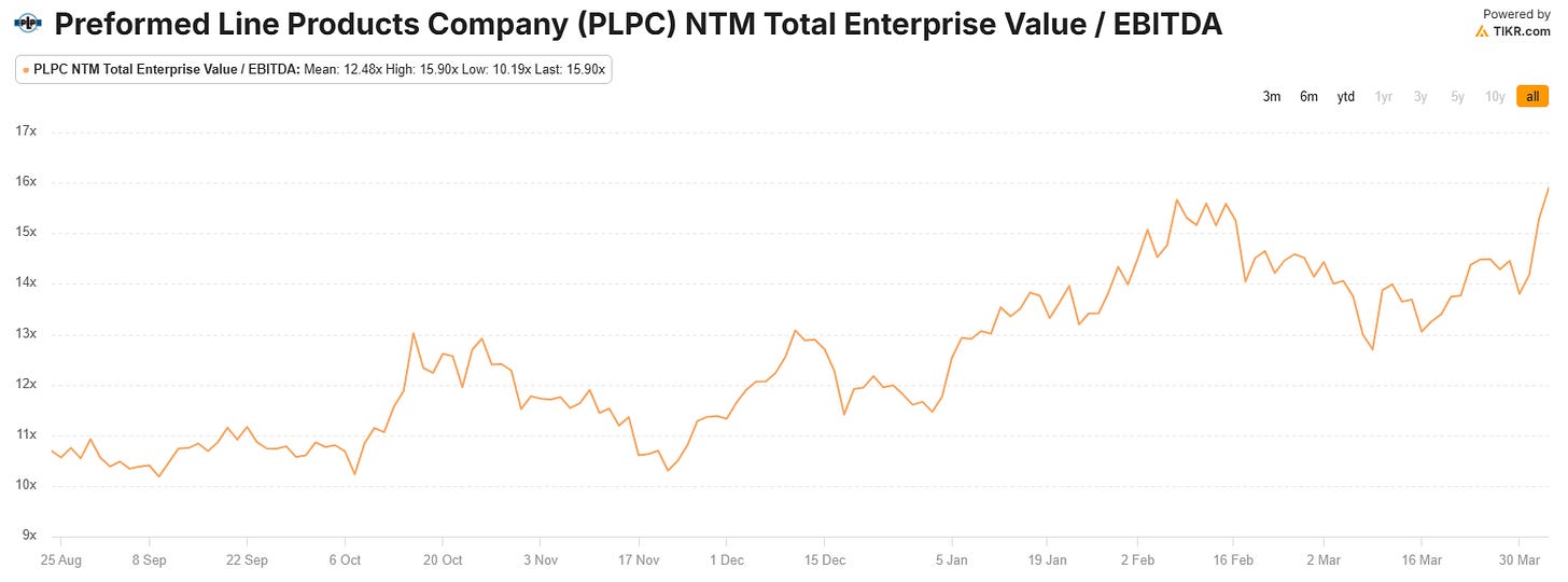 PLPC is set to grow ~16.1% CAGR through to 2029 which means by FY30 you’re looking +$1.3B in revenue. EBITDA margins for PLPC are currently 11.5% which is fairly low for an industrial hardware company with solid pricing power. I suspect when SG&A investment tapers off, and LIFO costs decelerate, PLPC can easily get +16% EBITDA margins.