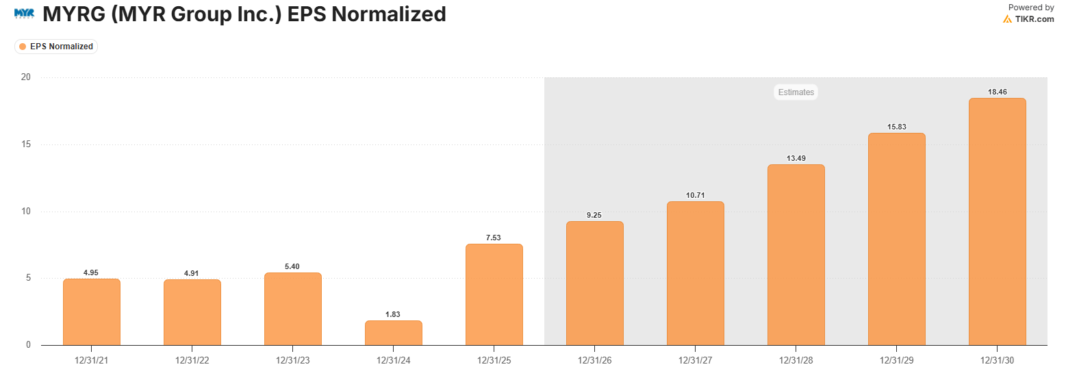 MYRG is therefore a very pure play on grid transmission. PRIM is a more diversified infrastructure play. PRIM’s forecasts are $9.30 EPS in FY30 which would put the CAGR at ~10.6% over the next 5 years. That’s solid growth in this niche, but for a 25x EPS, it’s quite high.