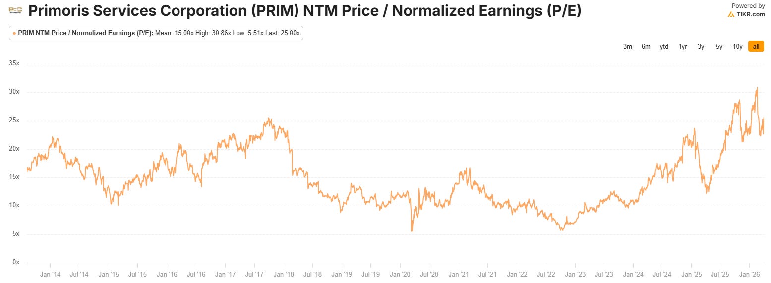 MYRG now trades at 1.1x NTM sales, 16x NTM EBITDA, and 31x NTM PE. That PE multiple is high but for 23% expected growth, it puts the PEG only ~1.35x which isn’t too bad. Assuming MYRG has an EPS of $18.50 in FY30 as per analysts, I suspect they should maintain a PE multiple over 20x which would mean you’re looking around $370 stock price on a fairly conservative multiple.