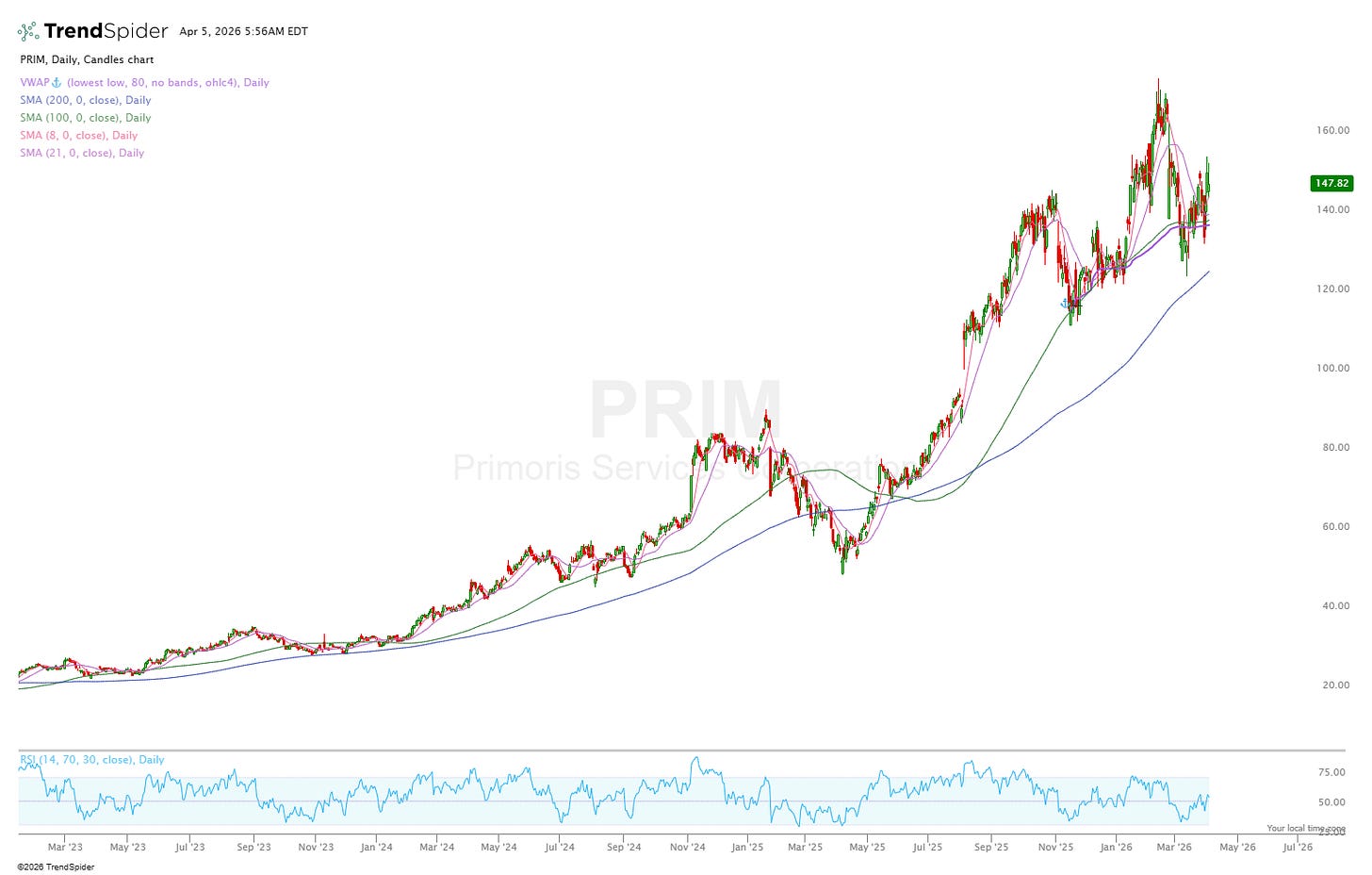 PRIM is slightly more diversified than MYRG above. It operates across utility scale solar, battery storage, natural gas generation, pipeline construction, and communications infrastructure. That means PRIM captures all angles of the grid modernisation spending and not just through transmission line construction. This gives PRIM a genuine hedge in the market when solar bookings soften for example… they can lean into other areas.