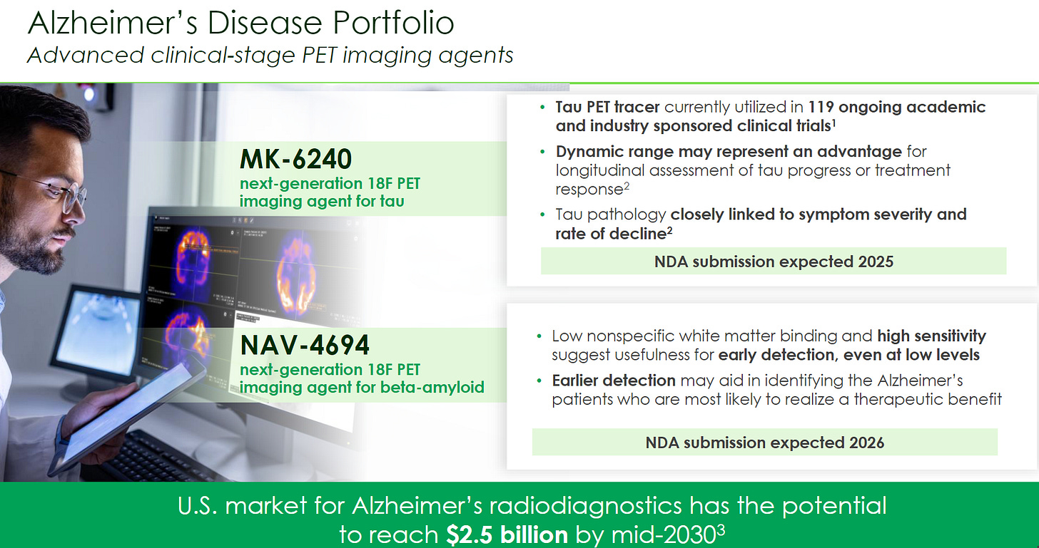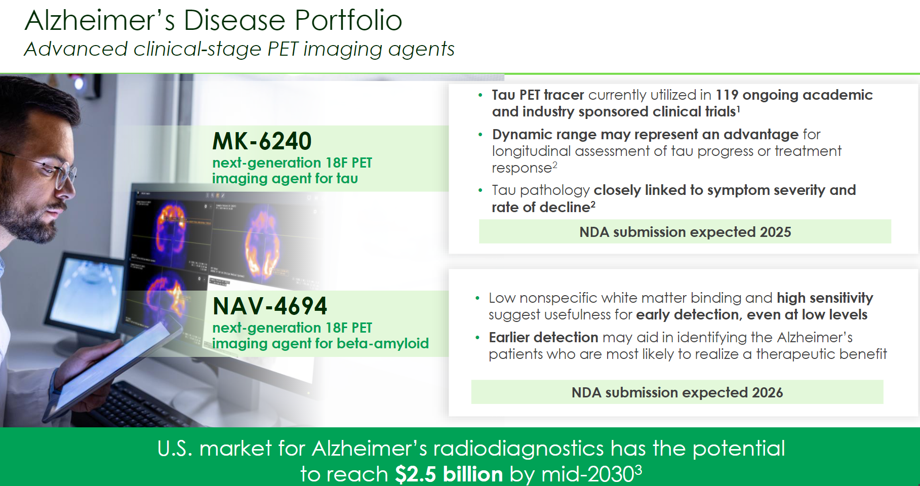 The other key investment case is a strong bet on the huge ($2.5 billion) Alzheimer’s market which LNTH are investing heavily into today with their MK-6240 and NAV 4696 products which are in 100s of clinical trials.