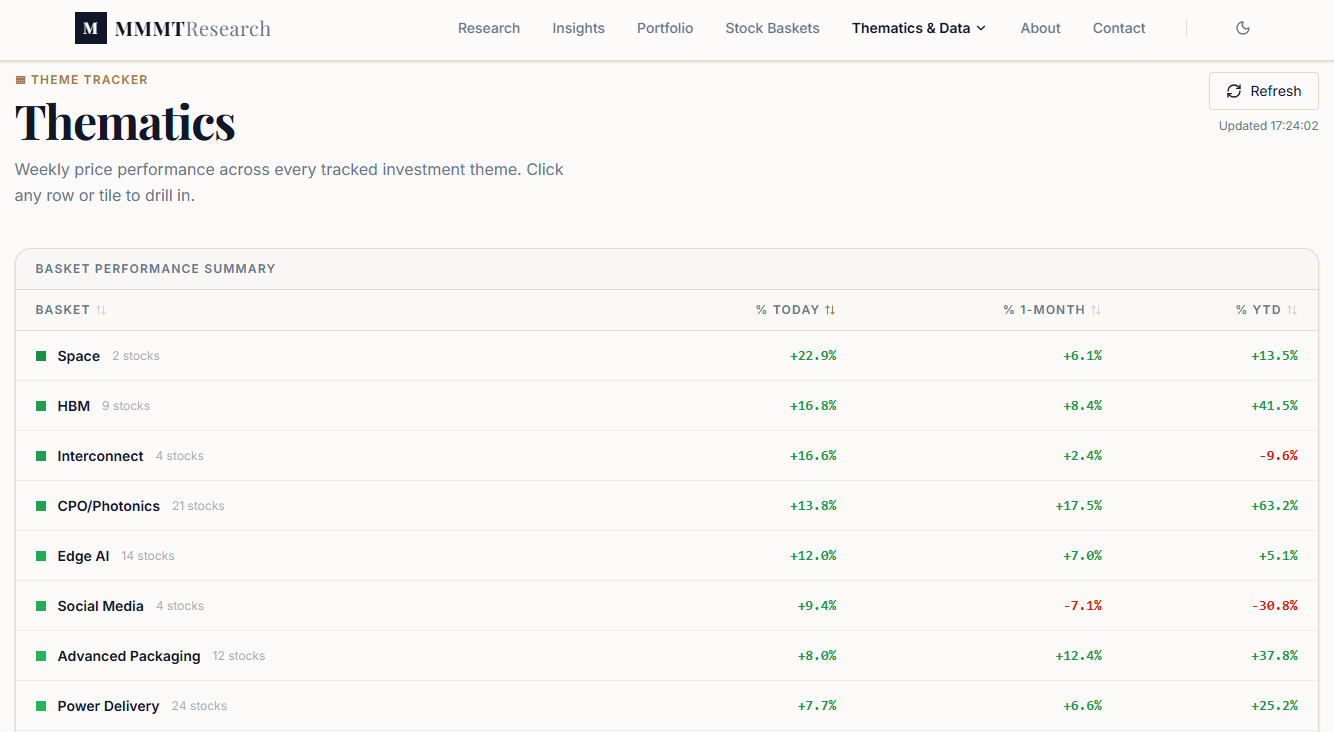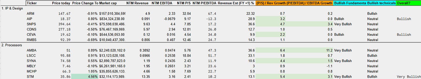 Each tab has every stock in that theme broken down by revenue and EBITDA growth rates relative to its EBITDA multiple.