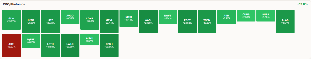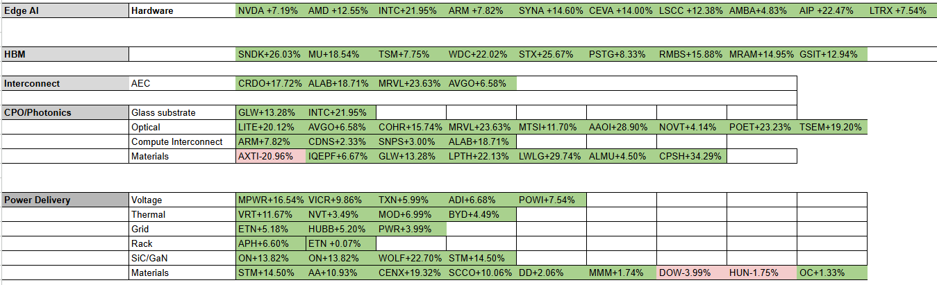 This tab collates all the stocks per theme and gives you the weekly price action on them to give you a very quick indication of what theme is running hot right now. No need to search each stock on your chosen website. You have access to all stocks, and all price movements per stock/theme right here.