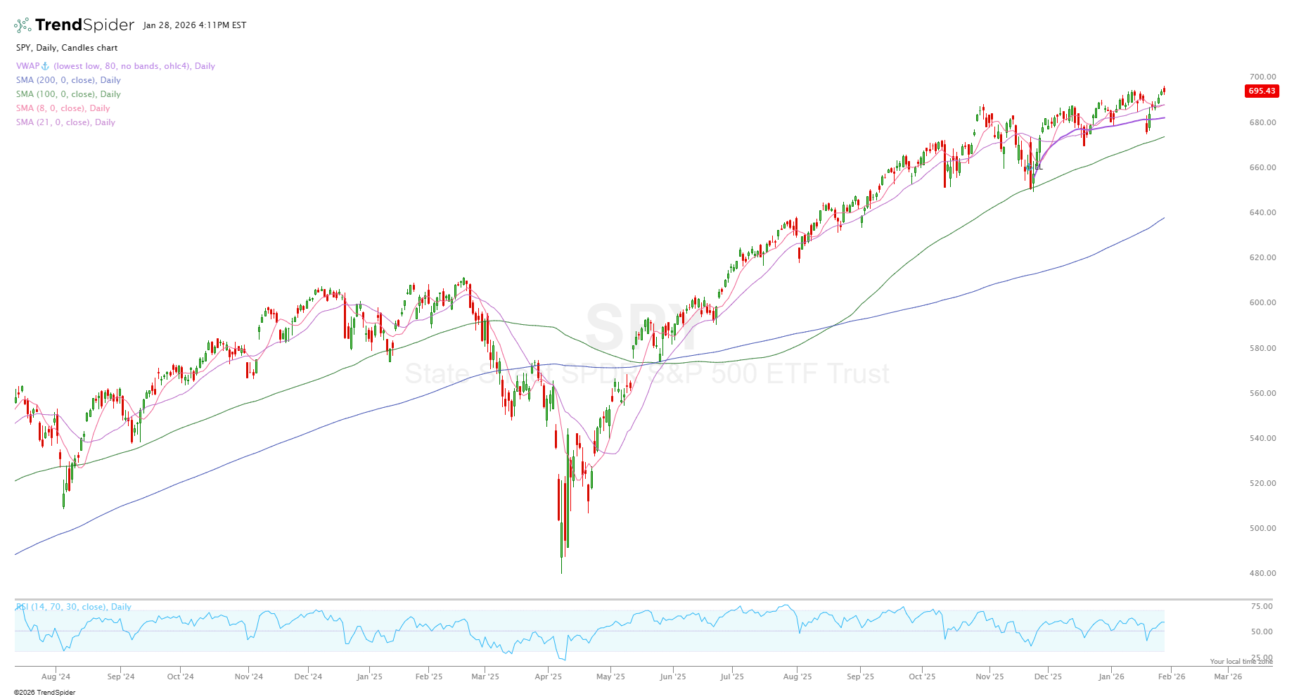 The SPY hit new all-time highs again today after looking pretty weak earlier in the week. Gold and silver continue to all-time highs as do many other commodities. It’s a weird market we’re in but this is the beauty of it. As long as the SPY remains above the key moving averages, I think we continue to see a market full of opportunities to make huge wealth.