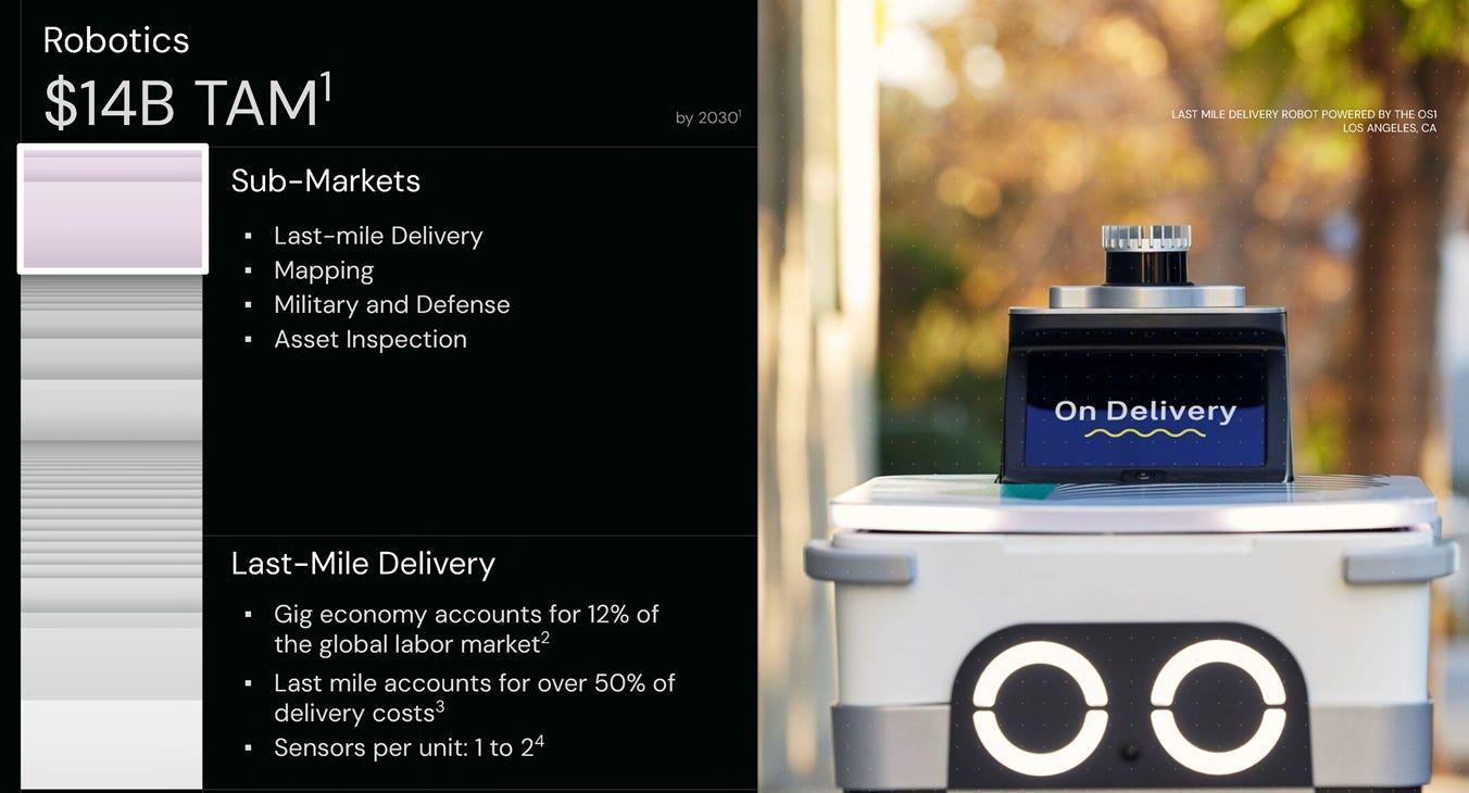 Automotive is the other smallest revenue contributor (single digit percentage) today but a huge piece of the long-term value. Most of the reason this revenue is quite slim today is because programs are largely in pre-production even more so than in the other segments. Robotrucking is a multi-billion dollar ($70B+) opportunity itself with the LiDAR specific part of that likely well above $1B. For OUST today, it’s mainly small R&D and pilot revenue, but once autonomy on the roads becomes a lot more common, these small wins so far can flip into a huge amount of units sold.