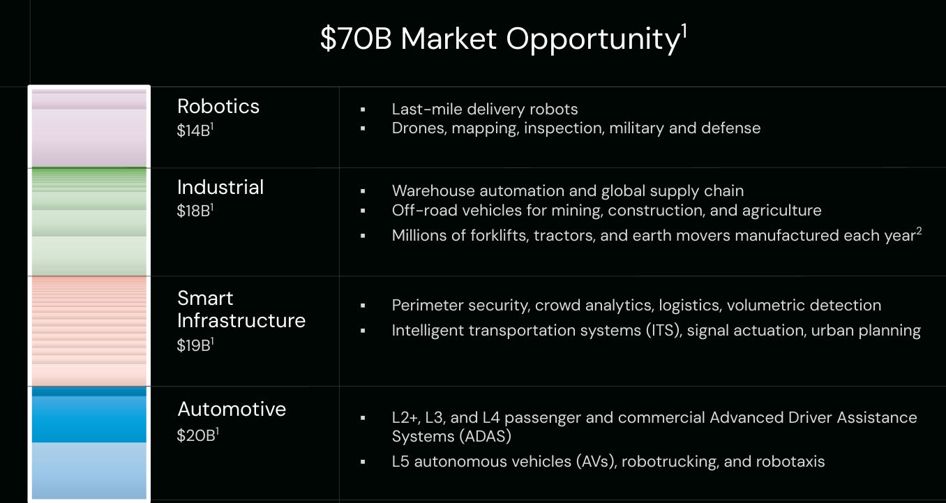 The stereo-camera / 3D camera market that StereoLabs operates in is a $2.5B market but the software and perception layer that this acquisition adds probably puts the TAM far above $70B in the long term. I won’t put a forecast out there for what I think the TAM likely is as it’ll but no more than an educated guess, but I suspect it adds far more than just a few billion dollars to the market OUST can win.