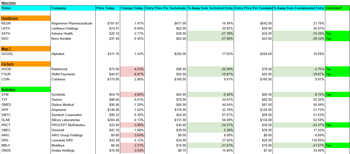 Here you have access to daily movements in my watchlist, entry price per technicals, entry price per fundamentals, and then ultimately whether I’m interested in the stock or not.