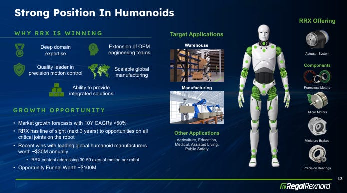 Description: RRX operate broadly in the motion systems niche including linear actuators, bearings, gearboxes, and couplings for aerospace and robotics. It has partnerships with ABB cobot integration giving them direct exposure to the humanoid and surgical robot space.