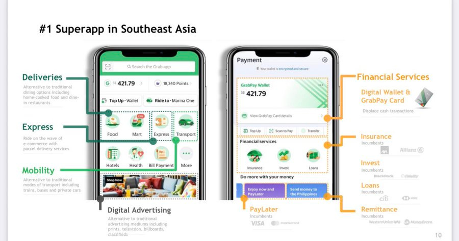 GRAB is a super-app based in Southeast Asia. I like to describe it as UBER, DoorDash, SOFI, and PayPal all combined into one. If you’re from the US or Europe you’re probably less familiar with the idea of “super-apps” just because they aren’t as common for one reason or another. This is likely due to stricter regulations, more technical expertise meaning “super-apps” struggle to take any market share away from companies that specialize in those industries, and also just consumer preferences in the West.