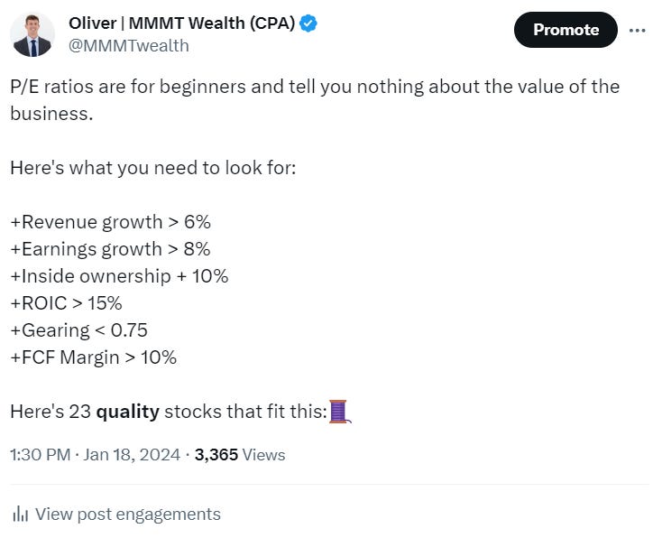 Of course there’s more to analyzing a stock than a quick screen like this, but this will immediately filter for stocks I’d be interested in.