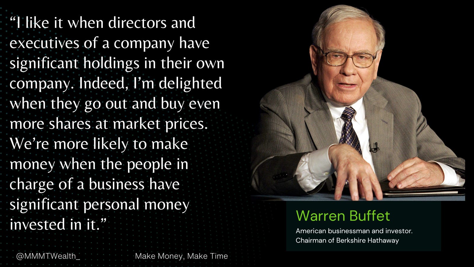 “I like it when directors and executives of a company have significant holdings in their own company. Indeed, I’m delighted when they go out and buy even more shares at market prices. We’re more likely to make money when the people in charge of a business have significant personal money invested in it.” - Buffett